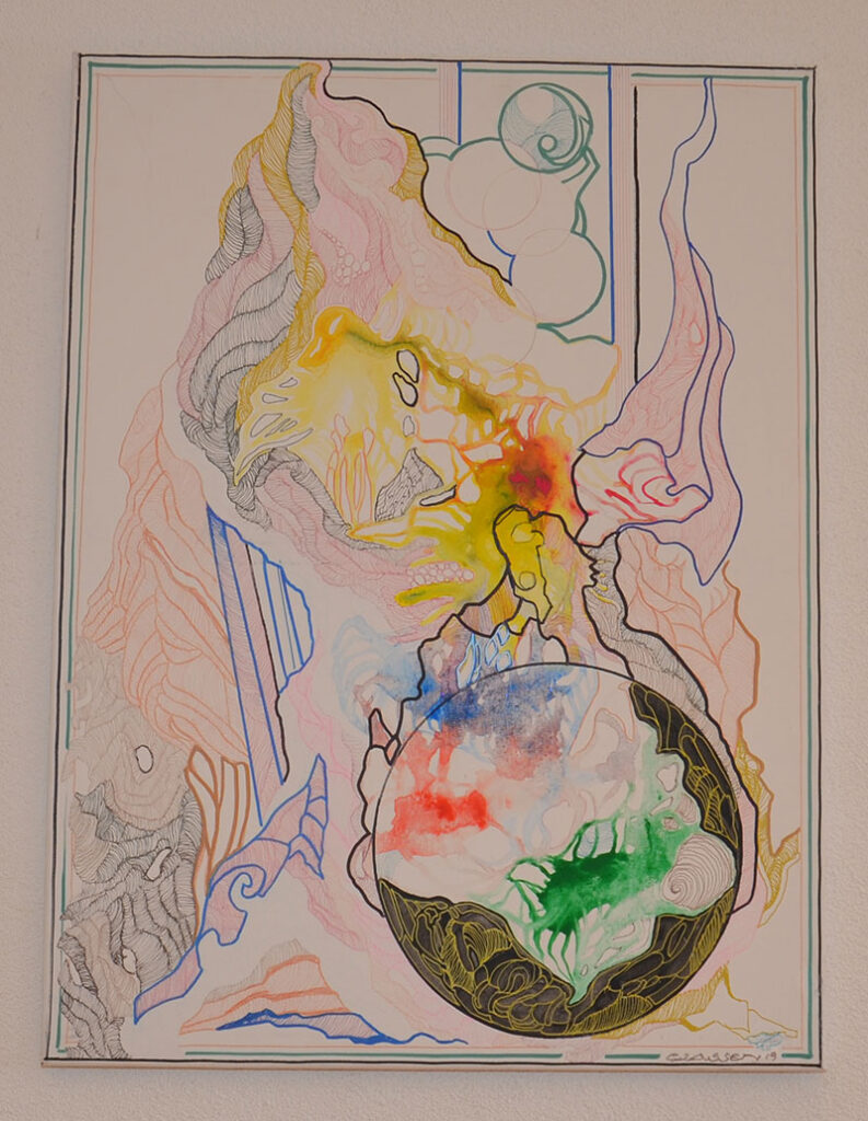 George Classen understands the recurring theme of “Physionomic Landscapes” as follows: He draws lines from the coordinate system of the (usually) human face, which he supplements with elements such as color and other lines. This creates a connection between autonomous abstractness and the actually real and visual. The intended ambiguity is intended to give the viewer the opportunity to stimulate their own imagination. George Classen uses the title “Chance and Necessity” of a book by the natural scientist and Nobel Prize winner Jacques Monod as the motto for the creation of his works. “Chance is the distribution of the impulse-controlled lines and colors, the necessity is the coordination of the elements into a coherent whole.”