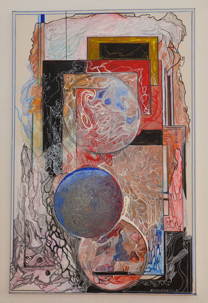 George Classen understands the recurring theme of “Physionomic Landscapes” as follows: He draws lines from the coordinate system of the (usually) human face, which he supplements with elements such as color and other lines. This creates a connection between autonomous abstractness and the actually real and visual. The intended ambiguity is intended to give the viewer the opportunity to stimulate their own imagination. George Classen uses the title “Chance and Necessity” of a book by the natural scientist and Nobel Prize winner Jacques Monod as the motto for the creation of his works. “Chance is the distribution of the impulse-controlled lines and colors, the necessity is the coordination of the elements into a coherent whole.”